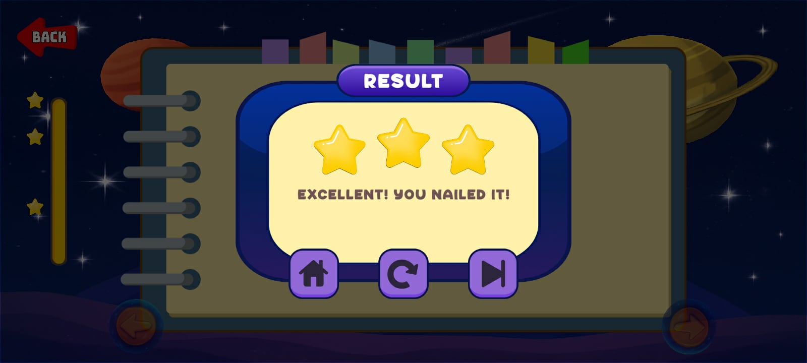 If the player fails to earn three stars, the game shifts into an exciting mini-game where they must avoid incoming asteroids to recover and unlock the next tracing challenge. In this survival segment, every collision reduces the player’s health bar, and only those who can last without losing all their health can continue tracing new alphanumeric characters.