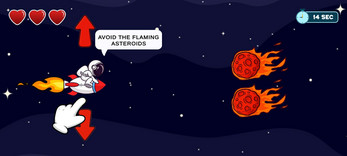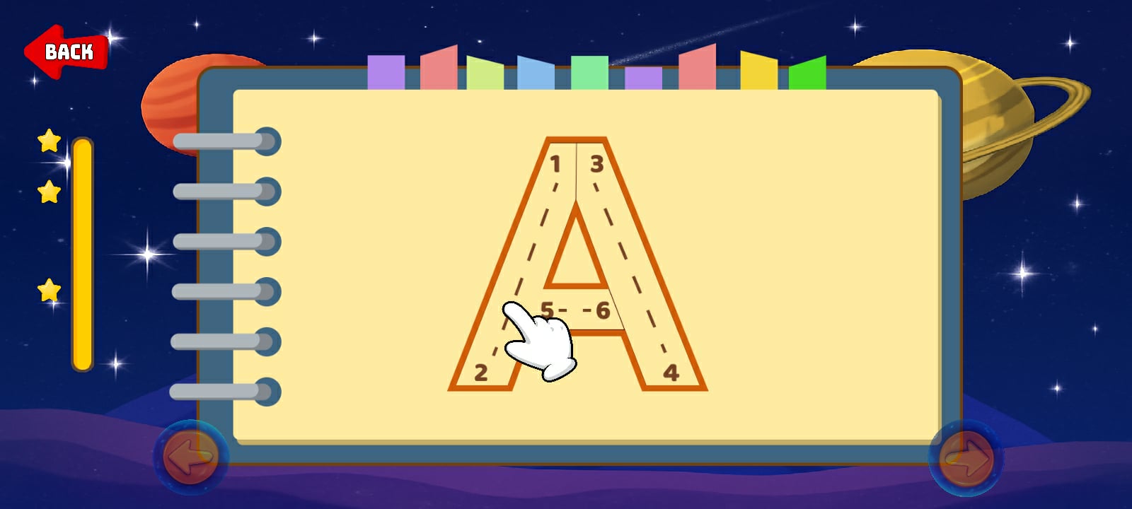 If the player fails to earn three stars, the game shifts into an exciting mini-game where they must avoid incoming asteroids to recover and unlock the next tracing challenge. In this survival segment, every collision reduces the player’s health bar, and only those who can last without losing all their health can continue tracing new alphanumeric characters.